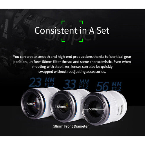 Introducing the Sniper Series APS-C Autofocus Lens Set from SIRUI — the brand’s first autofocus prime collection — featuring 23 mm, 33 mm, and 56 mm focal lengths in one matched kit. Designed for Fujifilm X (as well as Sony E and Nikon Z) mounts, each lens offers an ultra-fast f/1.2 aperture that delivers shallow depth of field, smooth bokeh and outstanding low-light performance. With built-in Eye AF and subject tracking support, these lenses are ideal for both stills and video workflows — empowering you to effortlessly isolate your subject, even when they’re moving fast. Offered in three finishes (black, white and silver), this cost-effective set provides a versatile, high-quality tool-set for creative shooters who want beautiful rendering across a 35 mm-, 50 mm- and 85 mm-equivalent lineup on APS-C format.